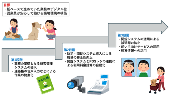 「この事業で最も魅力的だったのは、専門家であるアドバイザーの方から助言をいただけることでした。私たちだけでやみくもにデジタル化を進めたとしたら、きっと失敗していたと思います。また、さまざまなデジタルツールの導入費用の1/2~4/5を最大3000万円まで助成していただけることも、私たちのような中小企業にとってありがたいことでした。 アドバイザーの先生は大手のシステム会社に長年勤めていた経験豊富な方ですが、上から指導するようなことは全くありませんでした。そして、『私は犬のことはよく分からないので、ぜひ教えてください。そして、この園にとって良いシステムを一緒に考えましょう』とおっしゃってくれたのが、とても心強かったです。また先生は、保育園や老人介護施設で使われているデジタル日誌システムを探しだし、連絡帳への応用を提案してくれるなど、私たちには難しい情報収集まで行ってくれました」 こうして高田氏は、アドバイザーと一緒にデジタル化への計画を練っていった。その結果、下図のように3段階に分けてプロジェクトを進めることを決めた。